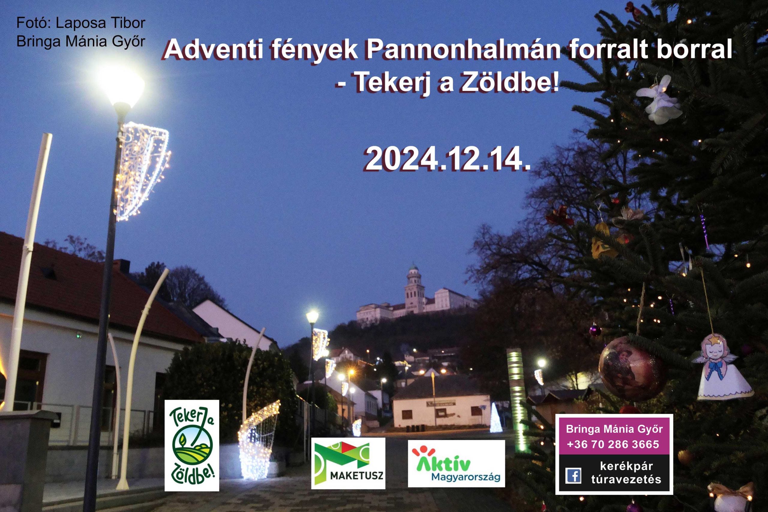 Van jó lámpád a bicajodon? Ha igen, gyere velünk egy kellemes forralt borozásra Pannonhalmára december 14-én! A Főtér mellett lerakhatjuk biztonságosan kerékpárjainkat és gyalogosan vághatunk neki felfedező túránknak. Kirakodóvásár, kézműves termékek, karácsonyi hangulat vár bennünket Pannonhalmán. Iszunk egy kellemes forralt bort, kóstolunk finom ételeket és választunk vásárfiát, majd megnézzük az adventi fényeket! ——————————————————————————————————– JÓ MINŐSÉGŰ ELSŐ- ÉS HÁTSÓLÁMPA LEGYEN MINDENKINÉL! SÖTÉTEDÉS UTÁN FOGUNK HAZATEKERNI, AMI PLUSZ ÉLMÉNY A KÜLÖNLEGESSÉGEKET KEDVELŐKNEK! (CSAK NYÚL ÉS GYŐR KÖZÖTT NINCS KIVILÁGÍTOTT KERÉKPÁRÚT) ——————————————————————————————————— A kerékpártúra a Tekerj a Zöldbe! túrasorozat része, ami a Magyar Kerékpáros Turisztikai Szövetség szervezésében az Aktív Magyarország támogatásával valósul meg. A rendezvényen mindenki saját felelősségére vesz részt! A túrán való részvétel feltétele a bukósisak használata és a műszakilag megfelelő kerékpár. A KRESZ szabályainak betartása kötelező!   A túrán való részvétellel hozzájárul, hogy a túráról készült fotó és videó felvételek megjelenhessenek nyilvános fórumokon. A túrához kapcsolódó regisztrációban szereplő személyes adatokat a törvényeknek megfelelően kezeljük. (GDPR) A részvétel regisztrációhoz kötött. Regisztrálni a bringamaniagyor@gmail.com email címen kell, a telefonszám, név és életkor megadásával. Kérjük, ha valaki nem Győrből jön, írja meg azt is. Részvétel ingyenes! Ha tetszik a program akkor 1.000 Ft adományt elfogadunk, amivel támogatod a Bringa Mánia Győr programjainak szervezését, környezetvédelmi programjainak megvalósítását. Az adományt induláskor a helyszínen átadhatod. Találkozó: 2024.12.14. 13:00 órakor Leier Autó Kft. parkolójában Indulás:   2024.12.14. 13:15 órakor Leier Autó Kft. parkolójából (Győr, Szauter út 9.) Érkezés: 2024.12.14. 18:00 órakor Leier Autó Kft. parkolójába (Győr, Szauter út 9.) Táv: 42 km Túravezető: Laposa Tibor +36 70 286 3665 okleveles kerékpártúra vezető (VAVÖ) idegenvezető Nehézségi fok: könnyű, családbarát A program változtatásának jogát fenntartjuk!
