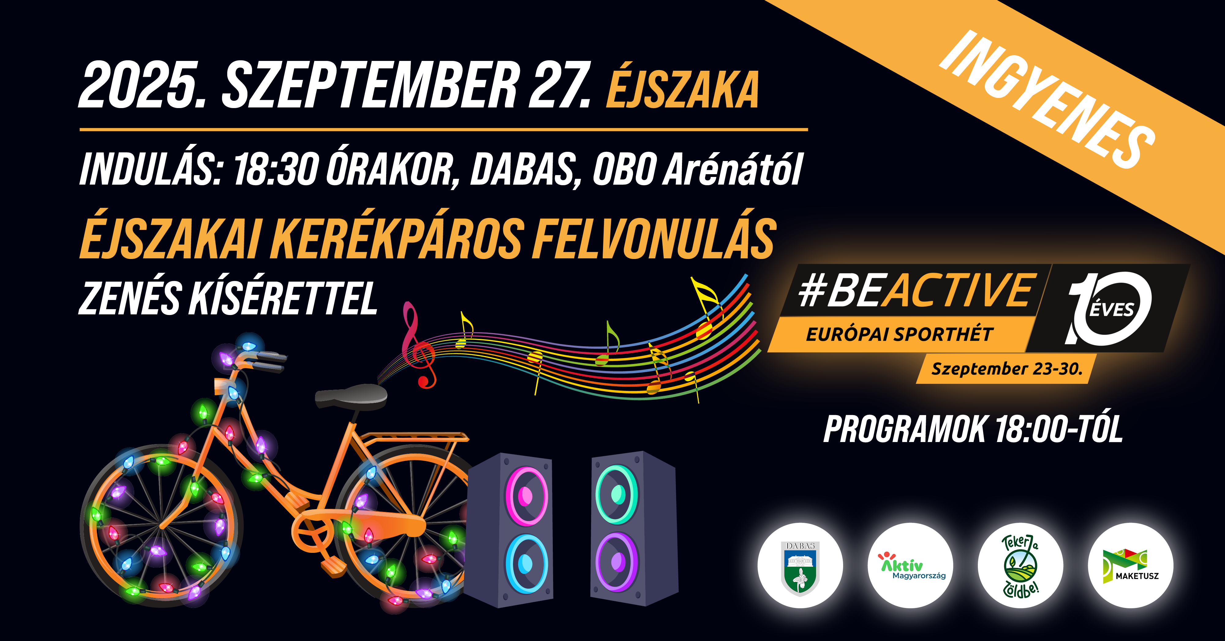 📣 Éjszakai Kerékpáros Felvonulás #Beactive Night Dabason a Végtelen Mozgás Éjszakáján- 2025! 🚴♀️🌙🎶 Idén különleges élmény vár mindenkit Dabason Szeptember 27-én, szombat este! Csatlakozz hozzánk a 10. Európai sporthéten , Beactive Night a Végtelen Mozgás Éjszakáján egy hangulatos, kivilágított éjszakai kerékpáros felvonulásra az OBO Arénától egészen a Dabas–Wellis Sportparkig! 🎵 18:00 tól gyülekező és szenior Örömtánc 🕘 Indulás: 18:30-kor Sáriba 🎾 Padel bemutató 19:15-19:45 🕤 Visszaindulás:19:45-kor Dabasra 🚴 Táv: kb. 2×6 km a főúton, félpályás zárás mellett, rendőrségi és gyalogőrségi kísérettel 🎧 zenekocsi a menet élén, zenél: DJ Tribe 📍 Wellis Sportparkban frissítőpont és mosdó vár benneteket! Obo Arénánál Büfé és mosdó lehetőség. Részvételi feltételek: ✅ Biztonságos kerékpár vagy roller ✅ Görkorcsolyával is teljesíthető (védőfelszerelés kötelező) ✅ Kötelező világítás és extra, kreatív díszkivilágítás ✅ Kisgyermekeknek védőfelszerelés és felnőtt felügyelet 💡 Öltöztesd fel a járgányodat fényekkel, és csillogjunk együtt az éjszakában! 🎉 Gyertek el, mozogjunk, világítsunk és bulizzunk együtt! ℹ️ További info: Boross Ágnes – 📞 06 70 338 9858 A kerékpártúra a Tekerj a Zöldbe! túrasorozat része, ami a Magyar Kerékpáros Turisztikai Szövetség szervezésében az Aktív Magyarország támogatásával valósul meg.