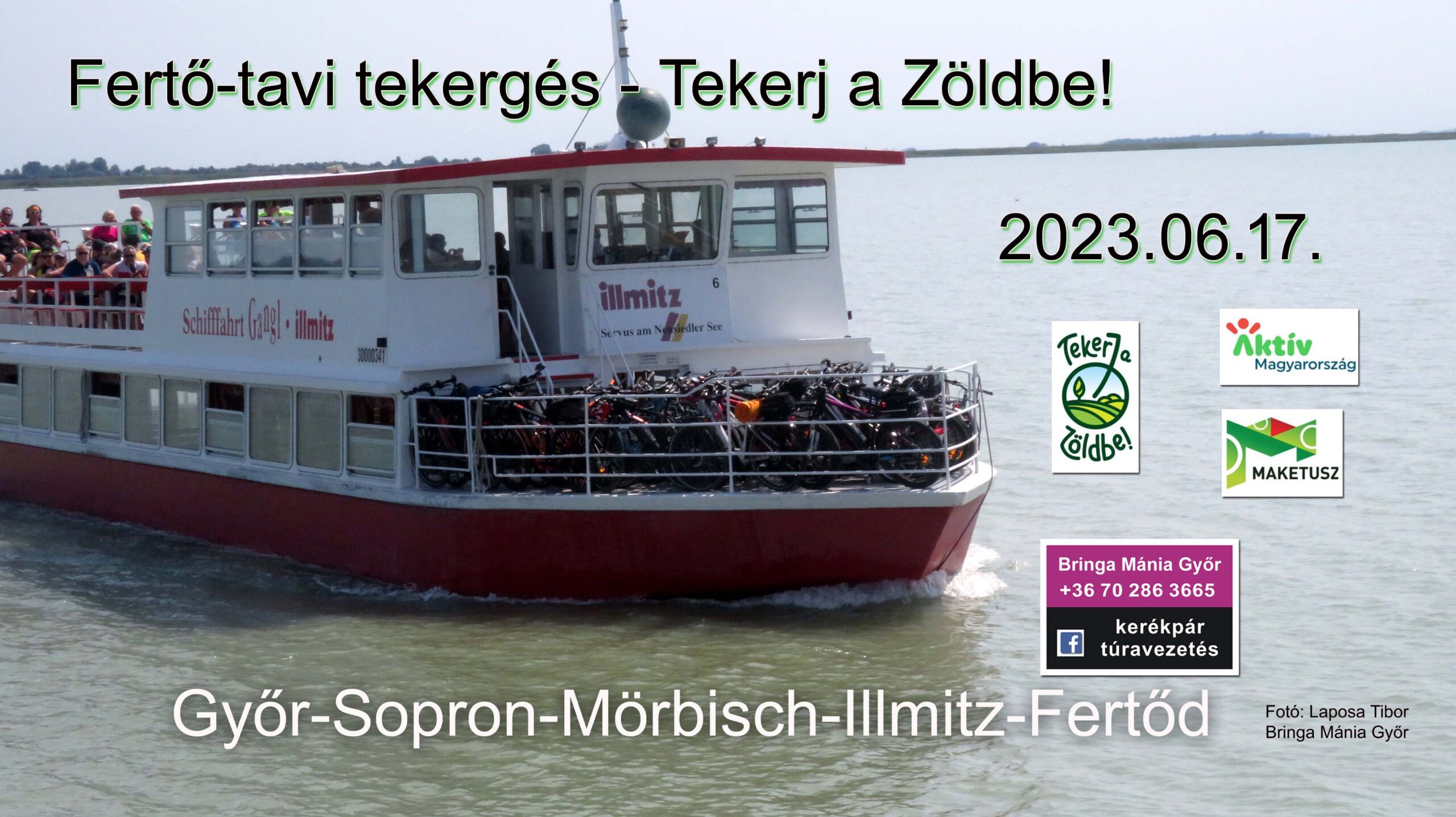 Győr – Sopron – Mörbisch -Illmitz – Fertőd hajózással Június 17-én Győrből/Sopronból indulunk kerékpártúránkra. Megállunk a Tómalomnál, majd Fertőrákosnál átlépjük a határt. A világhírű víziszínpad mellett már vár bennünket a hajó, ami átvisz minket Illmitzbe. Itt megnézzük a „barokk” szamarakat, a szikestóban rácsodálkozunk a madarak sokféleségére. Távcsövet hozzatok magatokkal! Ezután eltekerünk Mekszikópusztára, ahol megtudjuk e név eredetét. Utunkat a Lászlómajor felé vesszük, de előtte a kanyarban megfigyeljük a védett ürgék mindennapjait. A Lászlómajorban, az Esterházyak egykori gazdasági központjában az interaktív, élővilággal és a régi mesterségekkel foglalkozó kiállítások mellett egy fűszernövénykerttel és régi magyar háziállatokkal is megismerkedhetünk. A közelben madármegfigyelő helyről is nézhetünk madarakat. Sarródon megnézzük Magyarország legnagyobb nádfedeles épületét, (a Fertő-Hanság Nemzeti Park Igazgatóság épülete), majd bepillantunk a Tájházba. Fertődön megnézzük a Cziráky Margit Rózsakertet, ami most pomázik és utána körbe tekerünk a kastély parkjában. Kerékpártúránkat a Kerékpárosbarát Szolgáltató Gránátos Étteremben vadragu levessel, friss kenyérrel, „Fertődi-szörppel” és rétessel zárjuk. A túrához Sopronban a Vasútállomáson is lehet csatlakozni! Gyülekező a Győri Vasútállomáson: 8:35 órakor Gyülekező a Soproni Vasútállomáson: 10:15 órakor Indulás a Soproni Vasútállomástól: 10.30 órakor A rendezvényre a GYSEV külön kocsikat biztosít a kerékpárosok és a kerékpárjaik számára a Győrből 8.51-kor induló vonaton. A külön kocsiban maximum 30 kerékpárosnak van hely! Helyfoglalás a regisztráció sorrendjében történik, jelentkezzetek minél előbb! A túrát követőn hazautazás Fertőszentmiklós állomásról (3,5 km Fertődről végig kerékpárúton) különkocsikkal Győrbe (19:05) vagy Sopronba egyénileg (18:52). A vasúti menetjegyét mindenki maga váltsa meg, a Fertő tavi kerékpárjeggyel a kerékpár szállítás oda – vissza 50% kedvezménnyel. A belépők árai max. 2.500 Ft/fő (Lászlómajor+Tájház+Rózsakert)-fakultatív A hajójegy ára kerékpárral: 9 Euro/fő Vadragu leves+kenyér+rétes+szörp: 4.000 Ft/fő Szervezési díj: 1.000 Ft/fő A részvétel regisztrációhoz kötött. Regisztrálni a bringamaniagyor@gmail.com email címen kell, a telefonszám, név és életkor, lakhely megadásával, valamint hol csatlakozol a túrához. (Győr, vagy Sopron) A rendezvényen mindenki saját felelősségére vesz részt! Bukósisak használata és a KRESZ szabályainak betartása kötelező! A túrán való részvétel feltétele a műszakilag megfelelő kerékpár. A túrán való részvétellel hozzájárul, hogy a túráról készült fotó és videó felvételek megjelenhessenek nyilvános fórumokon. A túra- és idegenvezetés ingyenes Nehézségi fok: könnyű, családbarát A kerékpártúra a Tekerj a Zöldbe! túrasorozat része, ami a Magyar Kerékpáros Turisztikai Szövetség szervezésében az Aktív Magyarország támogatásával valósul meg. Táv: 47 km Túravezető: Laposa Tibor +36 70 286 3665 okleveles kerékpártúra vezető (VAVÖ) idegenvezető Nehézségi fok: könnyű, családbarát A program változtatásának jogát fenntartjuk!