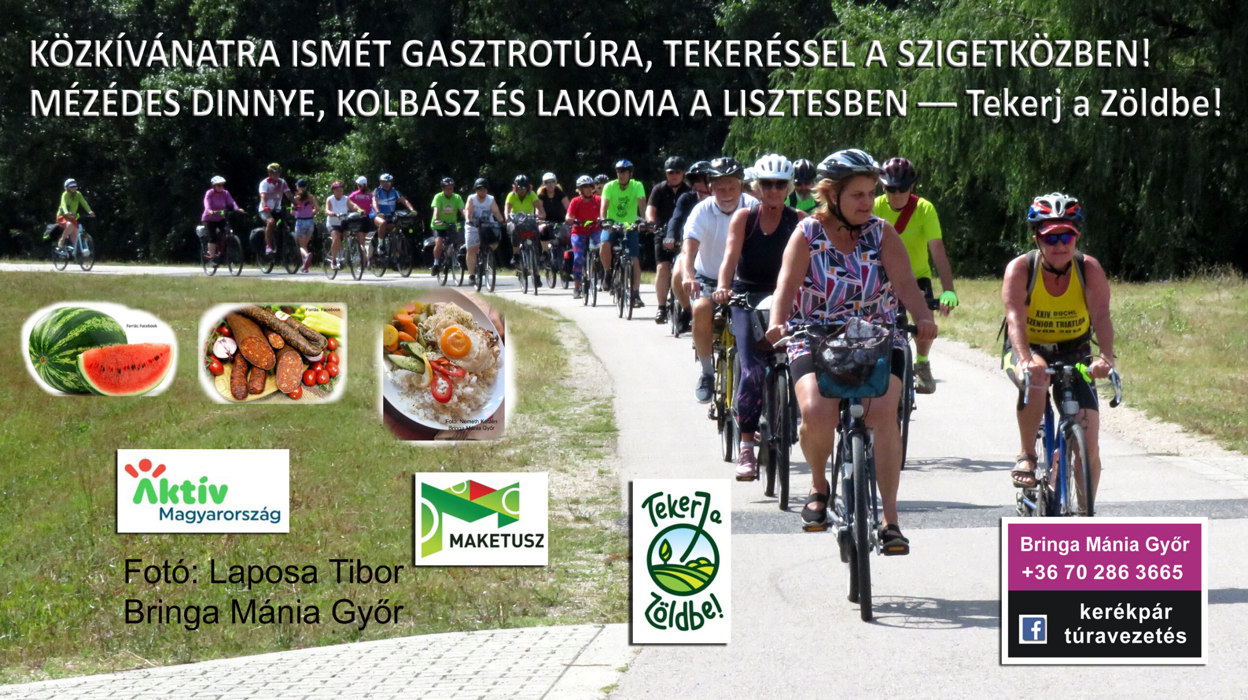 Július 27-én igazi gasztro élményekkel lehet majd gazdagodni egy kellemes kerékpározással összekötve! Győrladaméron betérünk a Kolbász Kamra műhelybe, ahol igazi csabai kolbász- és ízvilág élményeket fogunk átélni. A műhelyben lehet vásárolni kolbászféleségeket, a kóstolás ingyenes. Ezután kitekerünk a dinnyeföldre, ahol már várnak bennünket a mézédes dinnyék ingyenes kóstoltatásával, ahol megtudhatjuk, hogyan „készül” a dinnye, mennyi és milyen munkák kellenek a finom édes dinnyéhez. Megtudhatjuk azt is, mi alapján és hogyan válasszunk dinnyét a boltban. Utunkat Dunaszegen keresztül Kunsziget irányába folytatjuk. A Bolgányi hídon átkelünk, majd Mosonszentmiklóson keresztül érkezünk Lébénybe. Itt kívülről rápillantunk és megismerjük a Szent Jakab templom történetét, ami Magyarország egyik legjelentősebb középkori építészeti emléke, valamint híres zarándokhely is. A templombelső látogatása választható program. (1.000 Ft/fő a helyszínen fizetendő) A templom történetének megismerése után Lébényben megebédelünk a híres „Lisztes” Söröző-Étteremben, bőséges és ízletes (korábbi túrán már tapasztaltuk mindkettőt) ételek közül választhatjuk ki ebédünket, akár menüből, akár étlapról. Az éttermi fogyasztás a helyszínen fizetendő egyéni választás szerint. A „lucullusi lakoma” után Abda érintésével tekerünk haza. A kerékpártúra a Tekerj a Zöldbe! túrasorozat része, ami a Magyar Kerékpáros Turisztikai Szövetség szervezésében az Aktív Magyarország támogatásával valósul meg. A rendezvényen mindenki saját felelősségére vesz részt! A túrán való részvétel feltétele a bukósisak használata és a műszakilag megfelelő kerékpár. A KRESZ szabályainak betartása kötelező! A túrán való részvétellel hozzájárul, hogy a túráról készült fotó és videó felvételek megjelenhessenek nyilvános fórumokon. A túrához kapcsolódó regisztrációban szereplő személyes adatokat a törvényeknek megfelelően kezeljük. (GDPR) Jelentkezési határidő: 2024. 07.25. csütörtök 12:00 óra. Részvétel ingyenes! Ha tetszik a program akkor 1.000 Ft adományt elfogadunk, amivel támogathatod a Bringa Mánia Győr programjainak szervezését, környezetvédelmi programjainak megvalósítását. Az adományt induláskor a helyszínen átadhatod. A részvétel regisztrációhoz kötött. Regisztrálni a bringamaniagyor@gmail.com email címen kell, a telefonszám, név és életkor megadásával. Kérjük, ha valaki nem Győrből jön, írja meg azt is. Találkozó: 2024.07.27. 9:45 órakor a Jedlik híd Egyetem felöli oldalán, az Erzsébet-híd (Vásárhelyi Pál híd) emlékműnél. Indulás: 2024.07.27. 10:00 órakor a Jedlik híd Egyetem felöli oldalán, az Erzsébet-híd (Vásárhelyi Pál híd) emlékműnél. Érkezés: 2024.07.27. 18:00 órakor a Jedlik híd Egyetem felöli oldalán, az Erzsébet-híd (Vásárhelyi Pál híd) emlékműnél. Táv: 48 km Tervezett átlagsebesség 15-17 km/h Túravezető: Laposa Tibor +36 70 286 3665 okleveles kerékpártúra vezető (VAVÖ) idegenvezető Nehézségi fok: könnyű, családbarát A program változtatásának jogát fenntartjuk!
